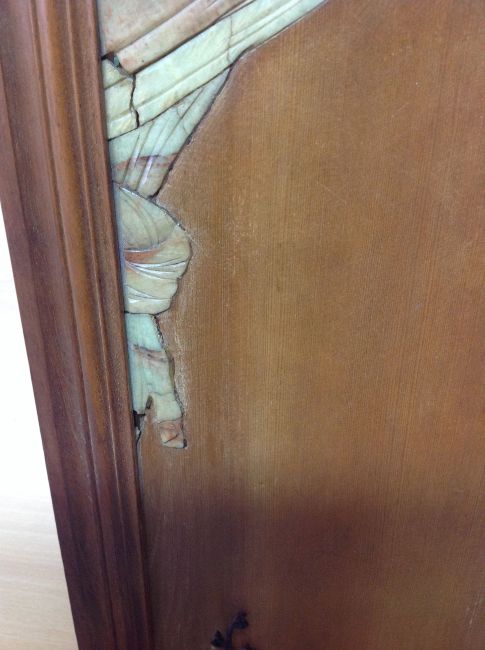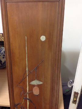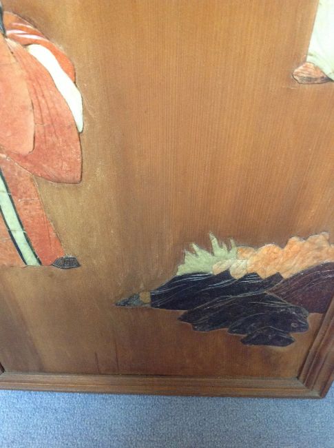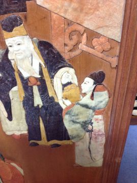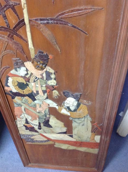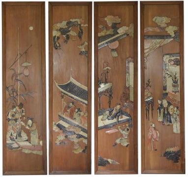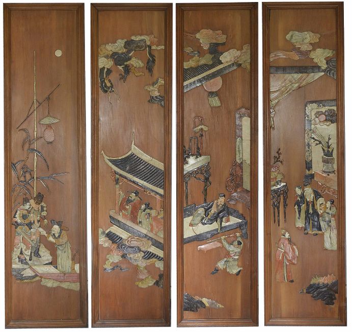 A set of four Chinese carved soapstone inlaid wooden panels, circa 1920, each panel depicting detailed figural scenes, the soapstone inlays well carved with much attention to the overall detail, each panel mounted in bevelled wooden frame approx. 135 x 38Condition: Overall good, one small piece missing from one panel in the corner, on another panel a crack to wood and another piece missing (minor) generally wear but generally appear good. Minor repair.
