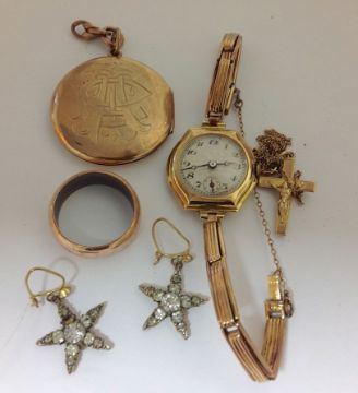 A ladies Edwardian 18ct gold wristwatchon 18ct gold expanding bracelet, together with a circular yellow metal locket, a pair of 9ct gold and paste star earrings and a 9ct crucifix on chain and a gold clad ring weight 34gCondition:
