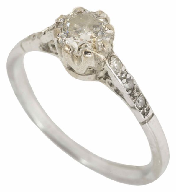 A delicate single stone diamond set ringthe white metal mount with diamond detail to shoulders approx weight 0.35 ct. Approx. size K/LCondition: Heavy mount wear overall