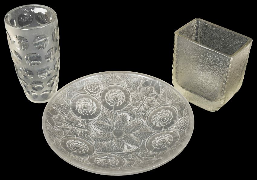 A 1930's Art Deco frosted glass shallow bowl moulded with stylised flowers and leaves together with a Scandinavian frosted glass vase 1950's together with a 1960's vase width 31cm (3)Condition: Bowl small flea bite to base, vases good condition