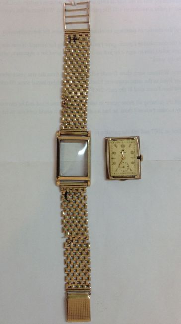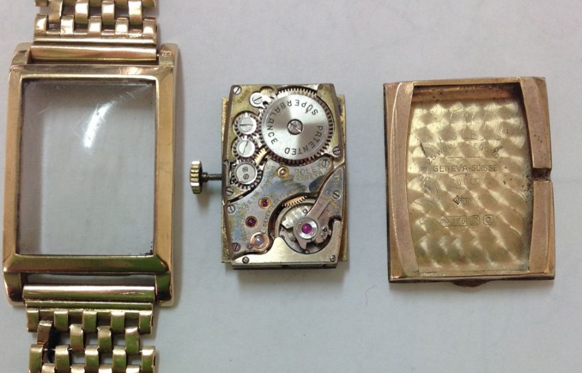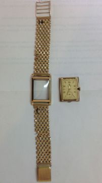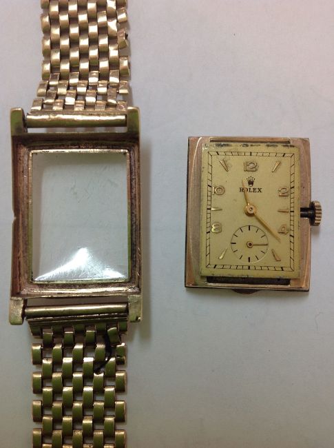 A 9ct gold Rolex gents wrist watch the rectangular gilded dial with gilt Arabic numerals and baton makers with seconds dial, the hand wound movement signed on the reverse, case back numbered 31060, hallmarked 9ct, on a 9ct gold mesh bracelet 33.6 grams approx, dial measures 22 x 17 mmCondition: overall condition is fair to good, with apparent scratches to the plastic face, which measures 26mm x 19mm,The rectangular dial is slightly dirty, the back cover is slightly dented,Is in working order, keeping time and both sets of hands moving freely,