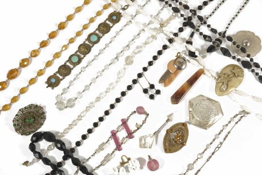 A collection of Art Deco dress jewelleryto include glass and other dress clips and a good selection of facetted coloured glass beads and wired necklaces and more (qty) Condition: Overall good but would suggest client view