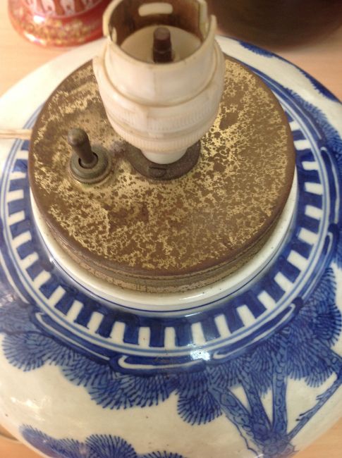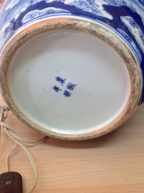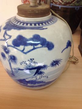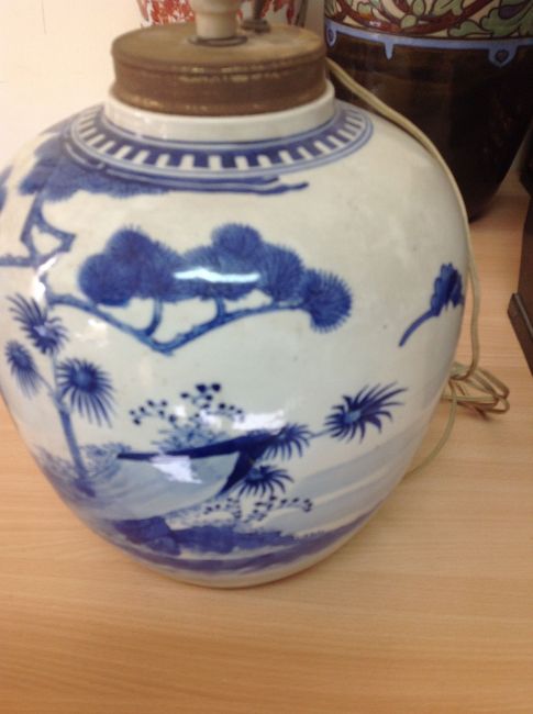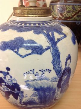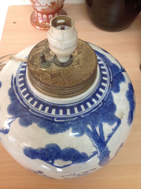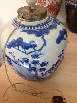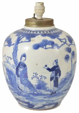 A 19th century Chinese blue and white decorated ginger jar painted in the Kang Xi style with figures and horse amongst prunus blossom garden, with four character mark to base, with adapted fitting to electricity height 26cmCondition: Minor imperfections to the glazing but no chips, cracks or obvious damage. Overall in good condition.