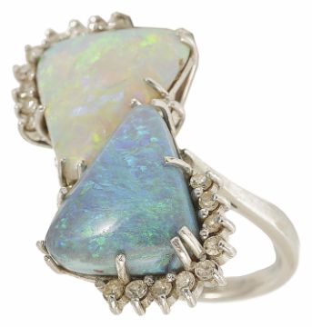 An unusual large precious opal and diamond double cluster ring, circa 1970, set with opposing 'light & dark' triangular shaped opals set within outer diamond set borders and single diamonds between, white metal mount, tests for gold Ring measures 3.2 cm. diagonally across. Size JCondition: Some cracking to light opal but good colour display, black opal is overall good