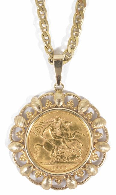 An Elizabeth II gold sovereign in 9ct gold pierced pendant mount and on 9K Continental flat link necklace Approx. weight 25.7Condition: Overall good