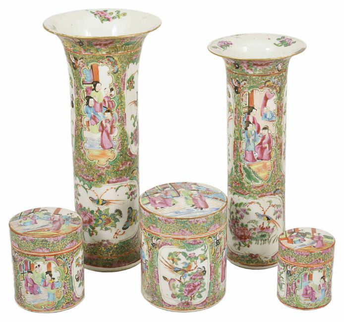 A small collection of famille rose,comprising of two cylinder shaped vases and three graduated lidded pots all decorated with pink and green flowers with figures and butterflies. Tallest vase 28cm high.Condition: Tallest vase in good condition, other vase has two chips to rim, largest measuring 2.5cm and crack and chip to base. Largest pot has cracks to base and smallest pot has small chip to base.