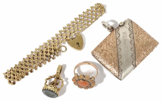 An early Victorian coral ring converted from a brooch and mounted on a 9ct rose gold wedding band, mount tests for gold sold together with a 9ct gold lattice design bracelet with heart padlock fastening, a seal fob with carved hematite intaglio seal and a Victorian hallmarked silver vesta case with gold overlay and overall scroll decoration, maker J.H., engraved and dated 1899 (4) Condition: Overall good, coral brooch has some wear