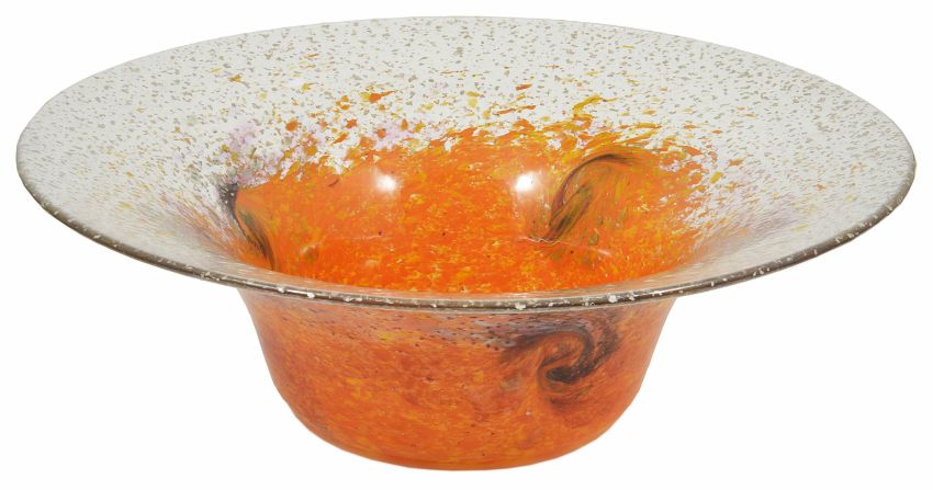 A large glass bowl of flared form with mottled design with purple swirls probably Monart width 39cmCondition: Good condition