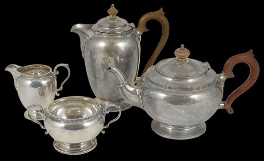 An Edwardian silver four piece tea sethallmarked London 1922 and 1923, comprising of a tea and coffee pot, twin handled sugar bowl, milk jug, of bulbous, baluster form, each raised upon a circular pedestal, with a band of leaf decoration 40 ozt total weightCondition: Condition is good for each item, obvious wear to bodies, coffee pot lid is warped; hallmarks worn