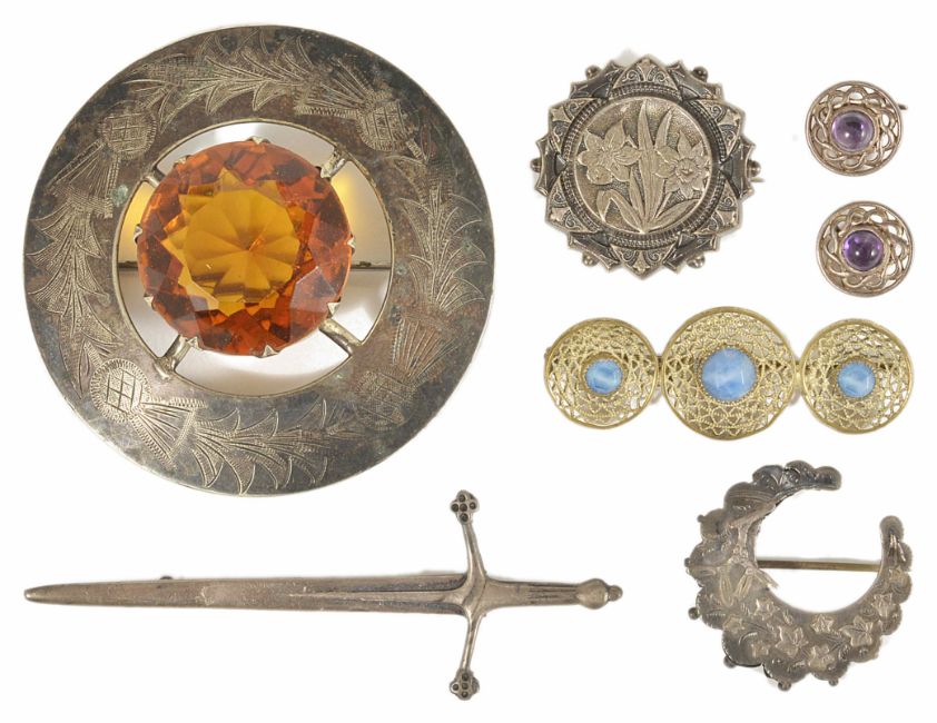 A large white metal Scottish plaid broochset with a large central paste 'citrine', together with a pair of cabochon amethyst earrings, two Victorian and one other white metal brooches and another brooch large brooch measures approx. 7 cm. diameter Condition: Some wear or damage to all items
