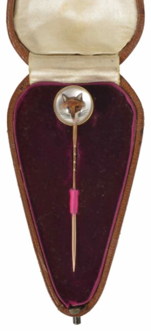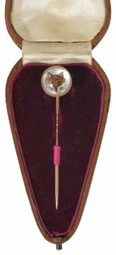 An Edwardian reverse carved and painted Essex crystal stick pin depicting a foxes head with tongue showing. Yellow/pink metal mount tests for gold. Original fitted leather case from 'Dobsons & Sons of Piccadilly' dated 1908 Condition: Overall good