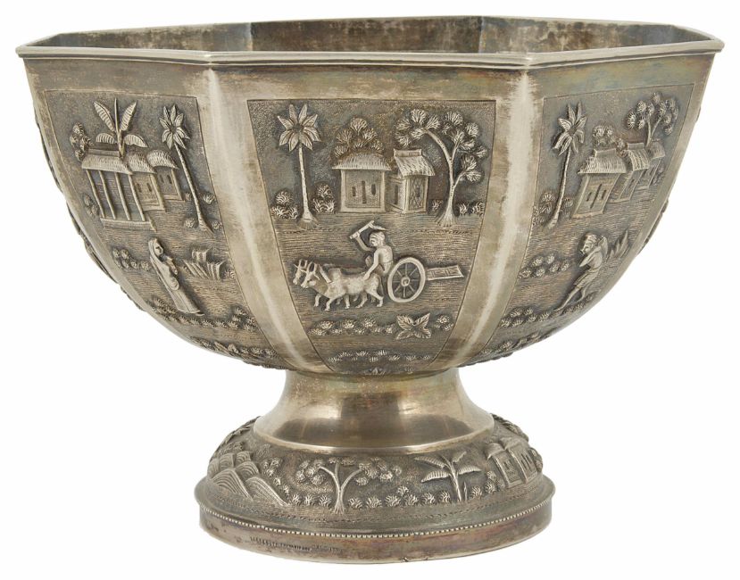 An Indian silver octagonal pedestal bowl by Dass & Dutt of Bhowanipore, Calcutta, late 19th century, each panel embossed with rural village scenes, stamped with makers name approximate weight 16.8 oztCondition: Generally in good overall condition.