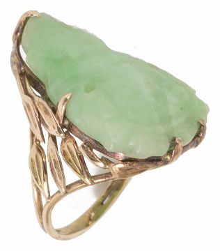 An unusual carved Buddha jade ring the mount of foliate yellow metal design, test as gold Size OCondition: Overall good