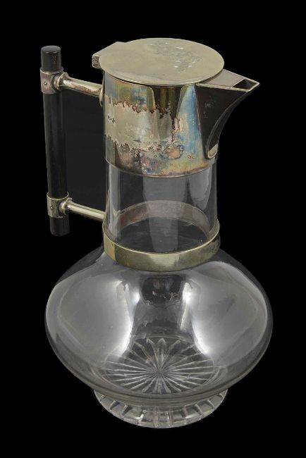 A silver plated and glass claret jug attributed to Christopher Dresser of typical form with registration lozenge 9EE (1881) height 22cm Condition: Glass needs cleaning and silver plate worn in places