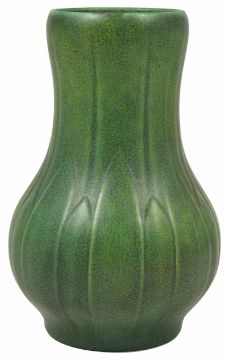 A Pilkingtons Royal Lancastrian crackle green glazed vase moulded with stylised leaf design, impress marks to base, shape number 2295 height 24cmCondition: Restoration to rim