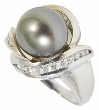 A large Tahitian grey pearl and diamond cocktail ring the white metal mount (tests for gold) with central large pearl within channel set diamond scrolls to one side and plain scroll to the other. Size O/PCondition: Overall good