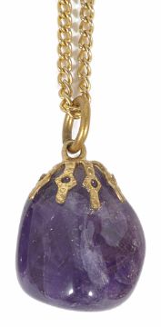 A contemporary 9t gold mounted oval amethyst crystal geode set pendant on gold chain, together with a 9ct gold mounted cabochon amethyst pendant on gold chain and two others (4) Giode pendant measures approx. 3.5 cm.Condition: Geode pendant some unevenness to reverse of mount, cabochon pendant mount slight bend