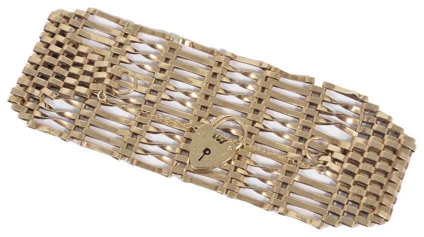 A mid 20th Century 9ct gold twelve bar gate bracelet with heart padlock fastening Approx. weight 23 gmCondition: Overall good