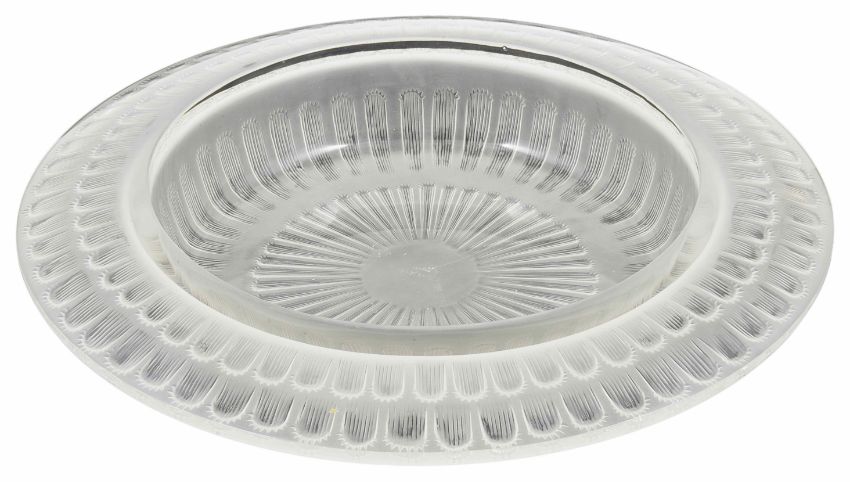 A René Lalique clear and frosted glass shallow bowl Helianthe pattern, stencilled mark 1930's width 35cmCondition: Scratches to base, flea bite chip to inner rim