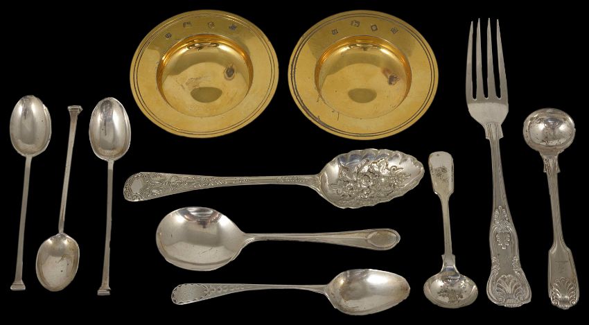 Two silver gilt pin traysand a collection of silver and silver plate tea and coffee spoons Condition: All with some wear
