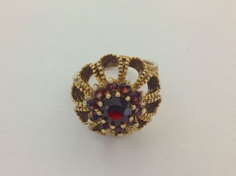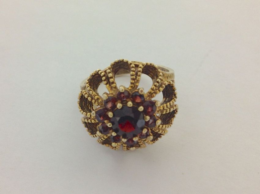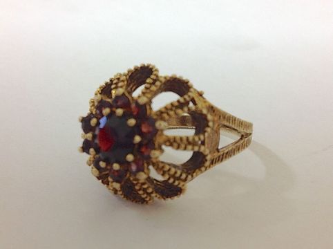 A contemporary 9ct gold garnet set ringwith textured finish and floral cluster design size RCondition:
