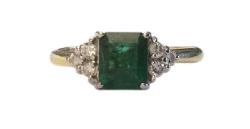A square cut emerald and diamond set ringthe central emerald of good colour and approx. 1.00 ct. set with diamond trefoils to either side, 18ct gold mount Size M/NCondition: Overall good