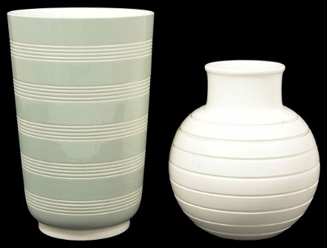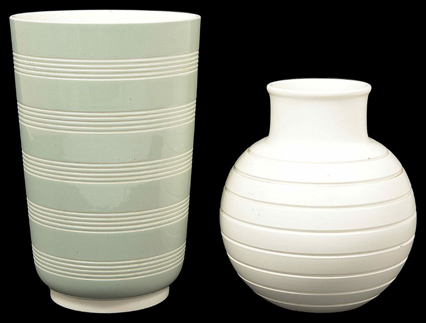 A Keith Murray for Wedgwood green and white ribbed vase of tapered cylindrical form, with green stamp to base, 20.5 cm high, together with a 'Moonstone' vase a/f, 16.5 cm highCondition: The former in good condition. The second vase with crack to rim measuring approximately 5cm