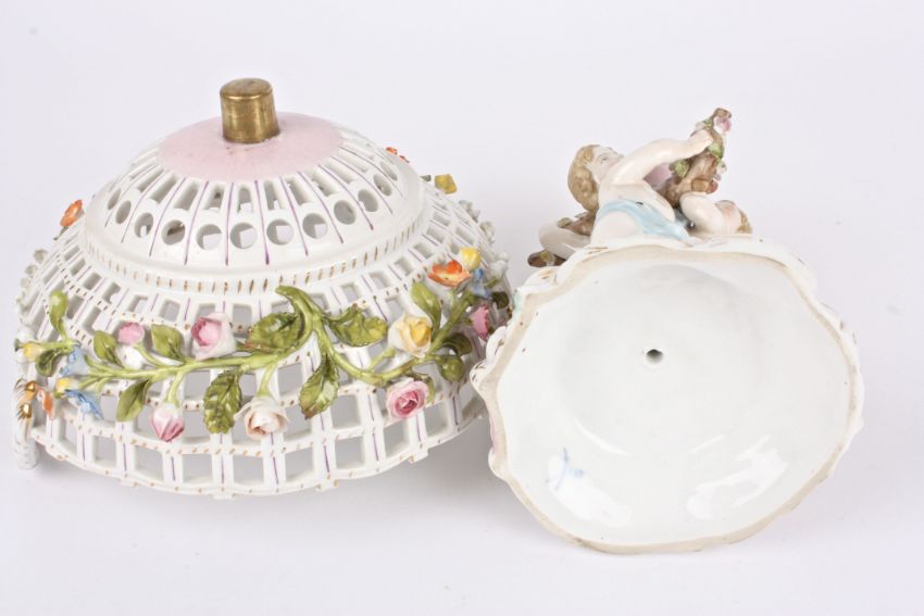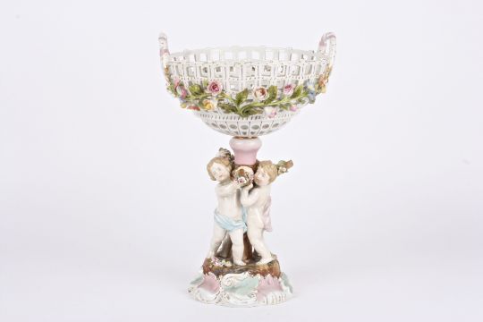 A 19th century Continental porcelain table centrepiece basketheld aloft by three cherubs holding branches and supported on a naturalistic and scrolled base. Crossed swords mark in blue. 33.3 cm high.Condition: Generally in good condition with a few small chips to flowers.