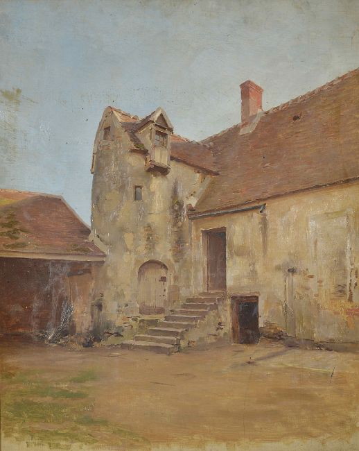 Continental School, circa 1900,  Two landscapes, unsigned the first depicting a French stone walled farm house with steps and cellar door, large oil on canvas sold together with another oil on canvas and landscape with wall by tree, both in gilt frames (2) 80 x 64 cm. 57 x 67 cm.Condition: Respectively canvas loose and small tear to canvas, canvas loose and substantial tear to canvas