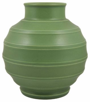 A Keith Murray for Wedgwood matt green vaseĀ of ovoid form, with horizontal bands and black stamp to base, 23.5 cm highIn good overall condition with no apparent chips cracks or damageĀ