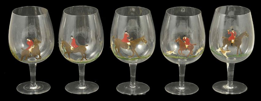 Five large brandy glasseswith differing hand-painted hunting scenes, mid 20th century height 20cmCondition: All mostly in good condition, some with some light wear to paint. No noticeable chips to glass