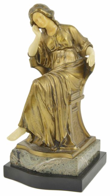 A gilt metal seated ladyearly 20th century, seated wearing a flowing dress, with ivorine hands, feet and face, raised upon plinth bases, no makers marks, 23 cm highCondition: Condition is fair with wear to gilt areas, ivorine slightly yellowing, no makers marks