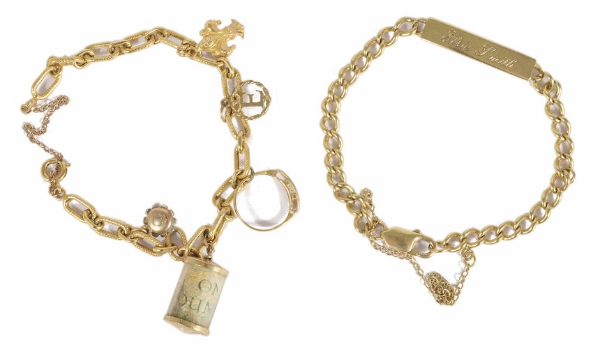 A fancy link yellow metal charm braceletmarks rubbed .750 with a mixture of 18 and 9ct charms including a £1 container charm, together with a 9ct gold curb link identity bracelet, engraved approx. weight charm bracelet 11.8 gm. - Identity bracelet 15.7 gm. approx.Condition: Overall good for both