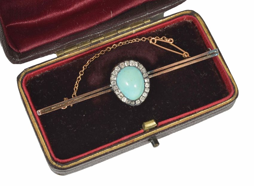 A good quality Edwardian turquoise and diamond brooch having central tear shaped turquoise of even colour set within a delicate border of matched rose diamonds and mounted on a double rose coloured gold bar, associated fitted box Cluster measures approx. 1.75 cm. top to bottom. Total weight approx. 6.1 gm.Condition: Overall good, some oxidisation to mount. Test for gold