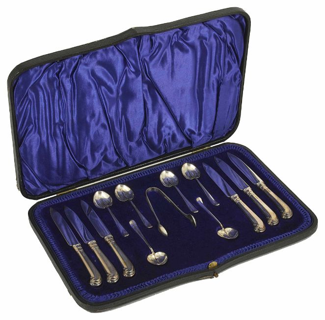 A cased silver fruit knife, spoon and tong setthe spoons of heart shaped form Condition: The tongs possibly replaced.