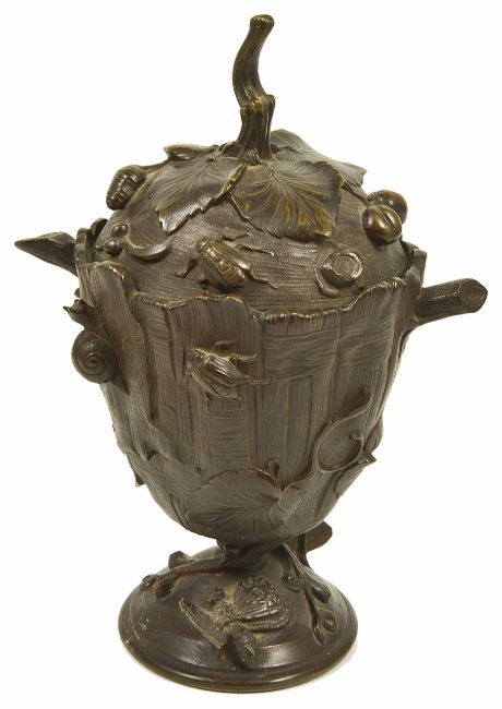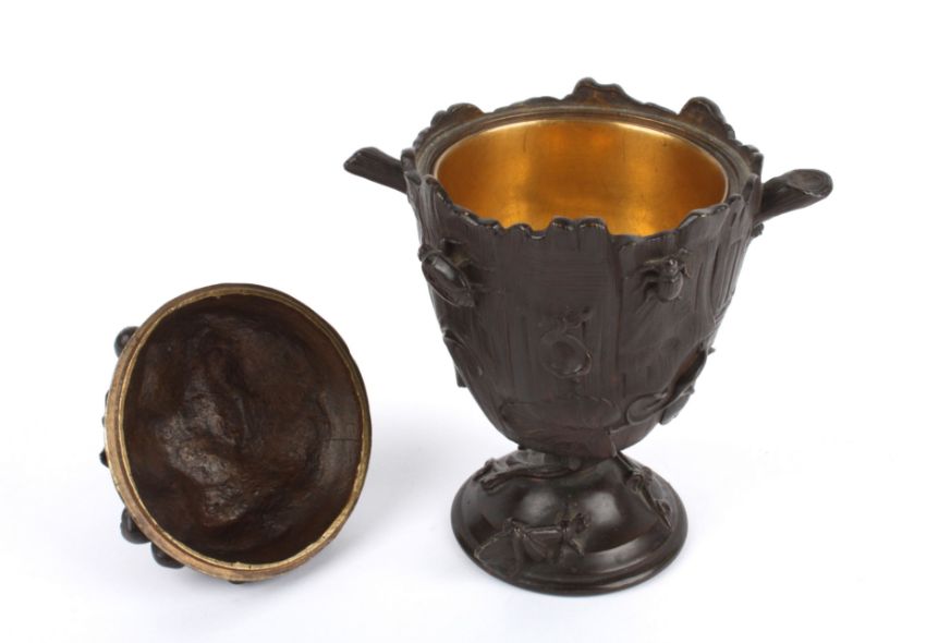 A bronze pedestal cup and cover, 20th centurythe baluster shaped body of the cup depicting a tree bark with applied leaf and insects, raised upon a circular pedestal base with applied grasshopper and ladybird, the interior with gilt metal drop in bowl, the cover with leaf branch finial, applied snail, wasp and berries height 21 cmCondition: Good condition with good patination, bears no marks, screw hole to base of pedestal, possibly mounted on another base at one time