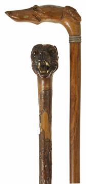 Two late 19th century/early 20th century walking sticks with dog handlesthe first realistically carved with head of a greyhound open mouth and glass eyes with veneered shaft, the second with a thin malacca shaft with two brass bands and carved handle in the form of a boxer, (2) the former 88cmCondition: The first with very good carved head but some wear to the veneer on the shaft the second in good overall condition.