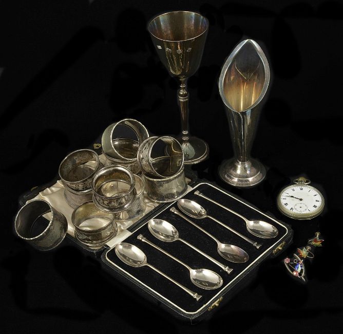 A George VI cased set of six silver coffee spoons, Birmingham 1937makers mark for William Sucking & Co, together with a silver and silver gilt goblet, London 1970, six silver napkin rings, four plated napkin rings, a plated bud vase and a cased metal pocket watch, silver brooch, silver earrings, (A/F) Condition: Fair condition is wear to hallmarks on silver items, some napkin rings dented and split, pocket watch with no glass