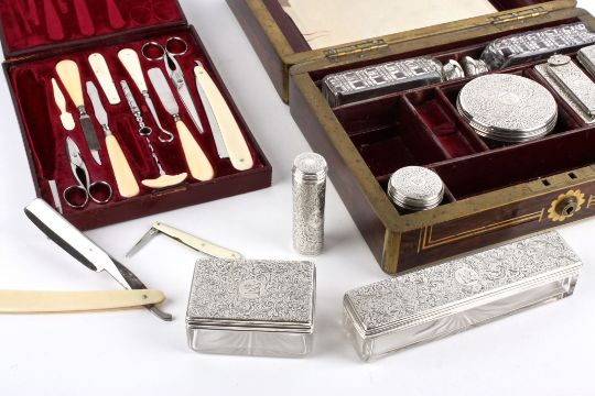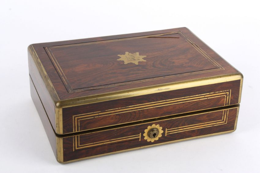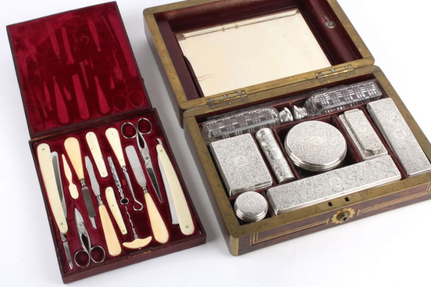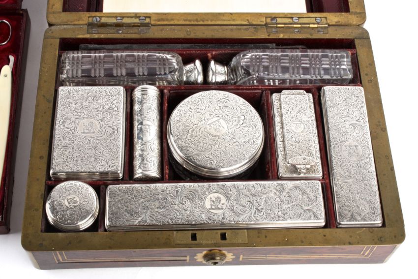 A good gentleman's Victorian fitted travelling rosewood dressing boxthe exterior with brass stringing, escutcheon and central engraved armorial, the interior fitted with silver capped glass bottles and jars, London 1841 George Richards, the interior of the hinged lid lined with crushed burgundy velvet, containing two sections with a gentleman's manicure set and a mirror width approx. 30 cmCondition: Good Condition, with obvious wear throughout, some splits in silver caps, some brass inlay slightly damaged on lid, possible replacement scissors