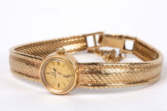 A ladies 9ct gold wind mechanism Omega bracelet watch, circa 1960The small circular dial with baton markers and on integral articulated textured gold, shaped strap bracelet dial measures 1.5 cm. diameter. Total weight 22.4 gm.Condition: Overall good