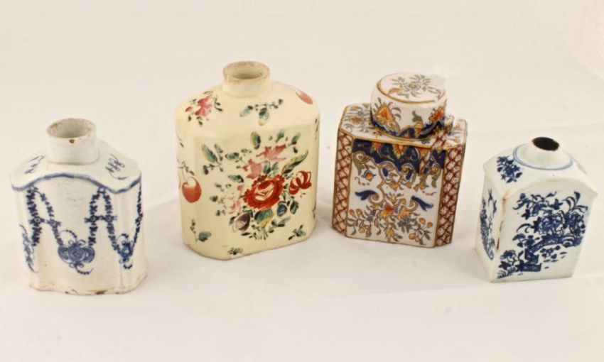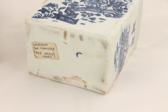 A Lowestoft porcelain tea canister,of rectangular form with blue and white garden scenes, together with a Continental faience tea canister and cover and two further tea canisters, one in blue and white trailing foliage and the other with colourful floral sprays, (4) Condition: Overall condition is fair to good, with chips to each rim, edges
