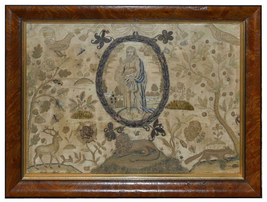 An early 18th Century silk and metallic thread needlework and stumpwork picturewith central oval embroidery on silk panel depicting a robed standing figure surrounded by fauna and woodland animals, raised work flowers and stumpwork lion on mossy hill below. Box framed and glazed. including frame 33cm by 44cmCondition: Splits to silk, silk threads faded, loose stitching, worn overall condition. General fading overall. Requires some attention.