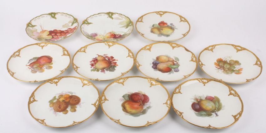 Eight German K.P.M. painted fruit porcelain plateseach painted with cluster of fruit to the centre and gilt painted rim, the reverse with under glaze red orb mark, initials and number, together with a pair of Nymphenburg porcelain plates, painted with fruit and leaves, blue and impressed marks to bases, (10) KPM: diameter 22cm; Nymphenburg: 21 cmCondition: One plate with small chip/nibble to the rim, another with restoration to the rim measuring around 5 cm width. Others in fair condition with very light scratching to some but no obvious damage. Nymphenburg - condition nice with wear to gilding and paintwork
