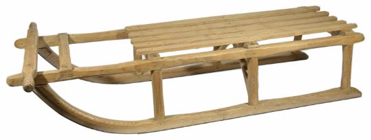 A vintage pine sledge with slatted seat upon turned supports with metal runners width 26.5 x 117 x 41 cmCondition: Condition is good with wear throughout, runners rusty and slightly loose at the top end but intact.