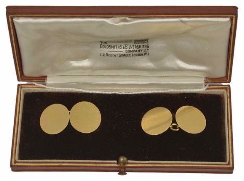 A pair of Art Deco simple polished circular 18ct gold cufflinkschain links and in associated red leather fitted box, Goldsmiths & Silversmiths Co. Ltd. Regent Street W1, marked 18 in square cartouche weight approx. 8.2 gms, diameter approx. 11 mm.Condition: Light scratching to surface, otherwise good