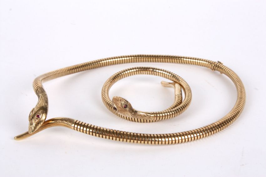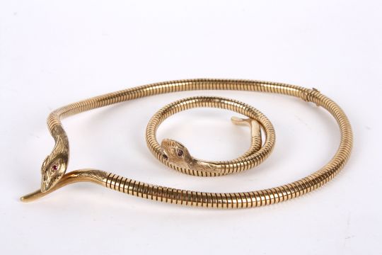 A gold articulated Victorian style snake necklace and matching banglemarked for 9ct gold and with steel spring, fashioned as a coiling snake with his tail under his head, ruby set eyes and together with the matching bracelet, (2) total weight 60.4 gm.Condition: Overall good