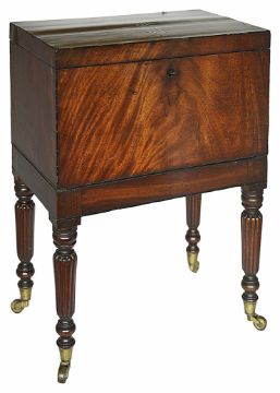 A mahogany rectangular cellerat, 19th centurythe hinged lid opening to reveal the interior with two mahogany lidded containers and pierced metal strainer, raised upon turned reeded tapering supports height 55 x 45.5 x 25.5 cmCondition: Condition is good with obvious wear throughout, cracking in lid veneer