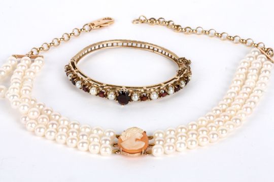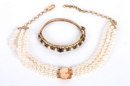 A contemporary three row pearl and gold mounted cameo chokerThe central carved portrait oval shell cameo set between triple cultured pearl rows to either side and with adjustable fastening, together with a yellow metal garnet and cultured pearl (tests gold) bangle, claw set and with scroll detail (2) bangle weight 16.5 gmCondition: Overall good, slight play on bangle hinge