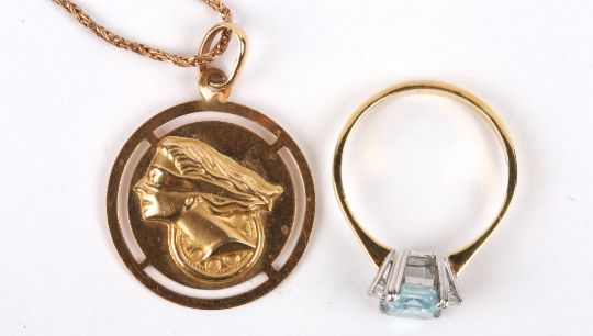 A delicate aquamarine and diamond 18ct gold mounted ringthe rectangular cut aquamarine mounted between a small single diamond either side, together with a 9ct gold circular pendant on 9ct gold chain (2) ring size O/P, pendant and chain weight approx. 6.00 gm.Condition: Slight bend to pendant