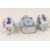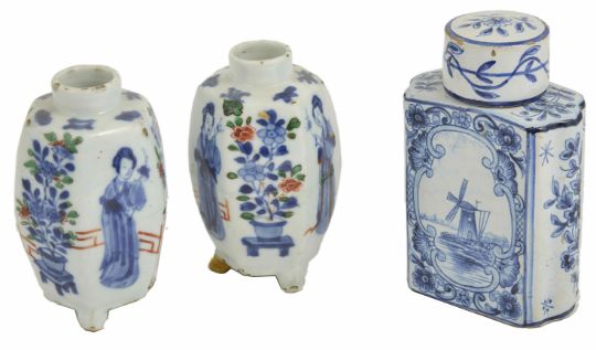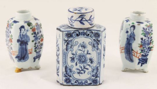 A pair of small Chinese porcelain vases, 18th century of hexagonal shape with oriental figures and foliage decorated on each panel, upon three supports, together with a Continental faience tea canister and cover, of rectangular form, the blue and white foliate sprays (3) height 10.5 cm, height 12.5 cm tea canister Condition: Condition is good with wear throughout, chips to rim of vases, one foot repaired on Chinese vase; chips to edges of canister cover, lid is a possible marriage to the caddy